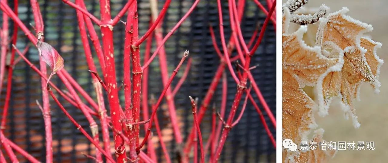 冬季庭院設計中自然不能或缺常青類植物,有些落葉灌木,如紅瑞木:適合在常綠樹叢前種植,其莖干、枝條會呈現紅色或黃色,非常亮麗,絲毫不遜色于夏天的色彩繽紛。