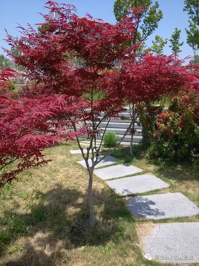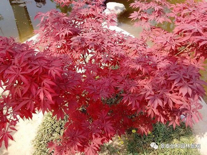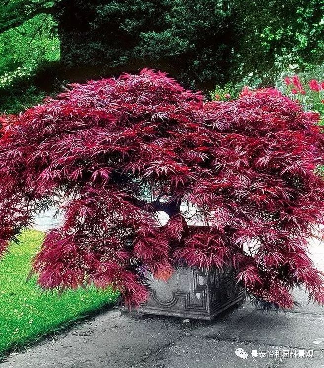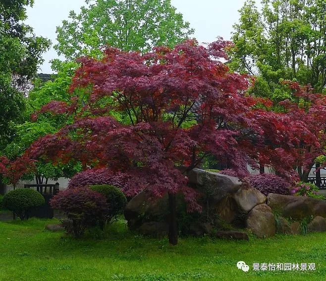 形態(tài)特征:落葉小喬木。樹姿開張,小枝細(xì)長。樹皮光滑,呈灰褐色。單葉交互對(duì)生,常叢生于枝頂。葉掌狀深裂,裂片5-9.裂深至葉基,裂片長卵形或披針形,葉緣銳鋸齒。春、秋季葉紅色,夏季葉紫紅色。嫩葉紅色,老葉終年紫紅色。